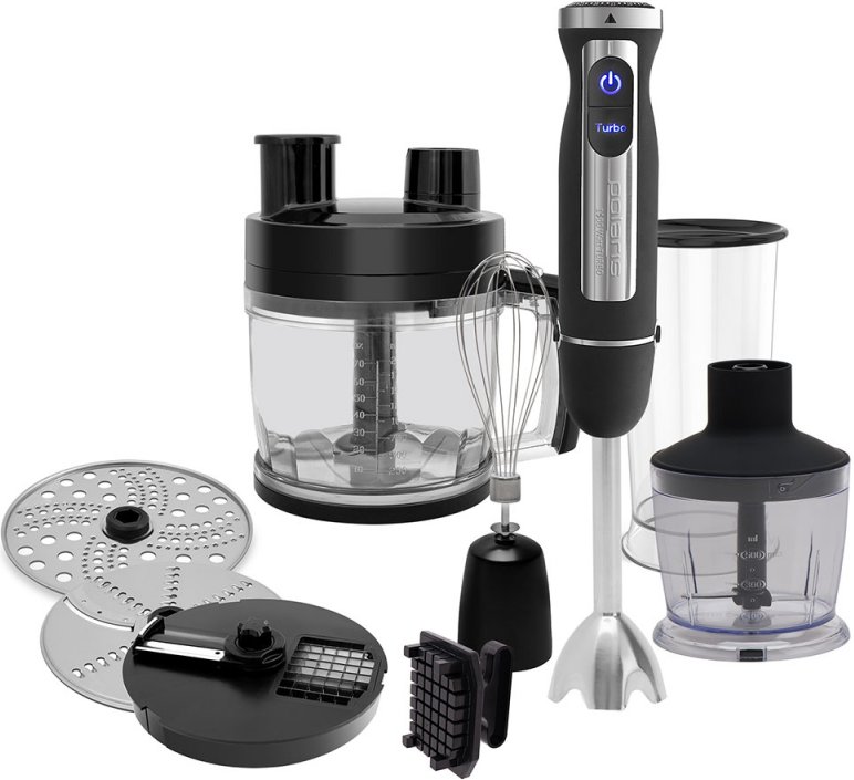 «Сестра» предыдущей, Polaris PHB 1590AL Cube отличается тем, что насадок у нее чуть меньше – 5 в 1, но они покрывают большинство задач. Мощность тоже 1500 Вт, скоростей 30 + Турбо, лодербатон. Блендер идет в компании с измельчителем 0.5 л, мерным стаканом 0.7 л, венчиком и двумя дисками (для кубиков и пластинок). Плюс привычный набор блендерной ножевой части с титановым покрытием – прям мастер по смузи и коктейлям. Примерно стоит 8000 руб.