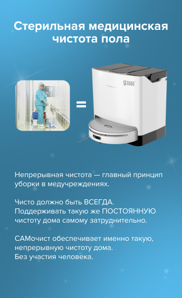 Эталон самостоятельности САМ моет и пылесосит дом, регулирует интенсивность уборки. САМ очищает пылесборник, САМ сушит и моет тряпки и наполняется чистой водой.
