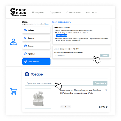 2. В разделе «Товары» найдите поле «Промокод или сертификат».